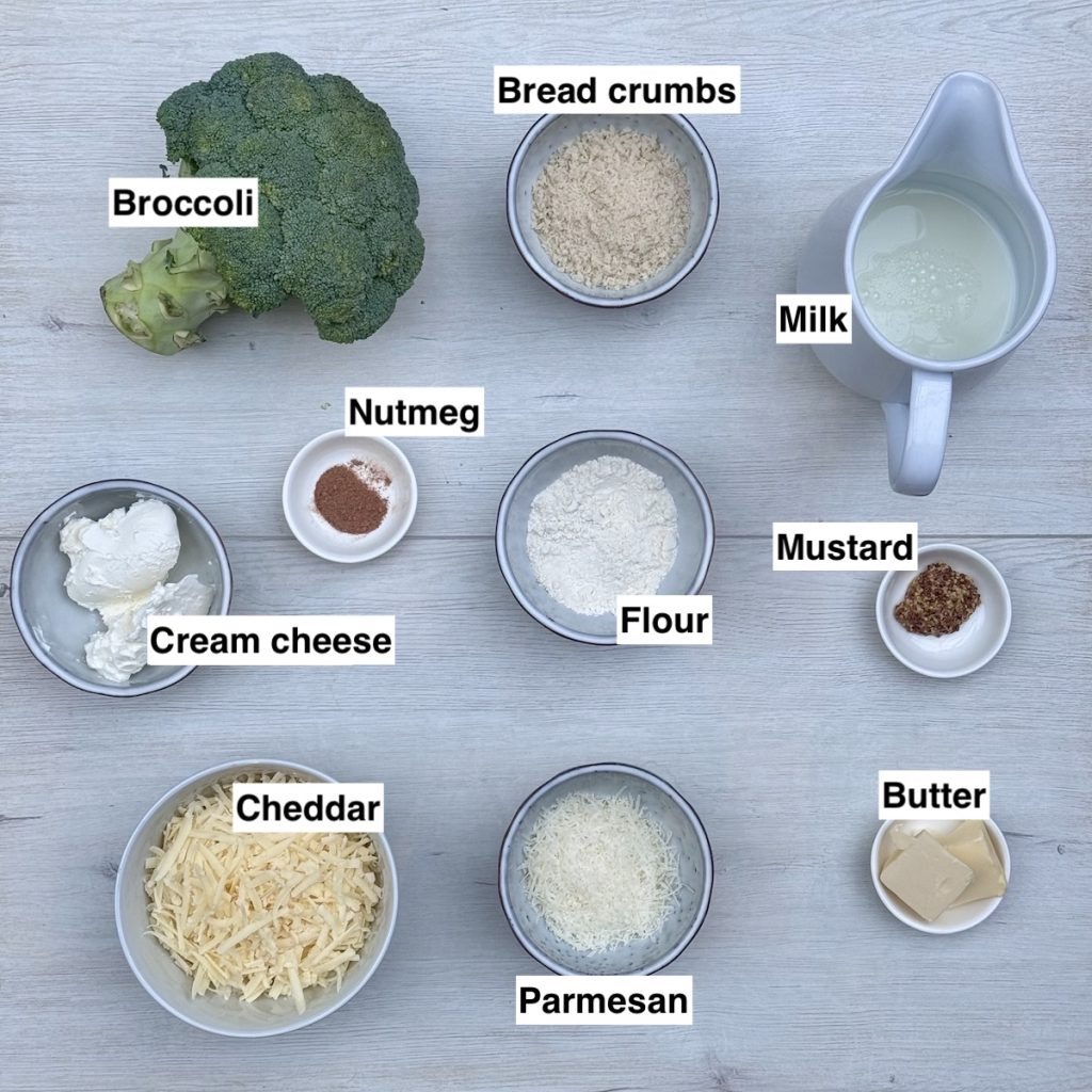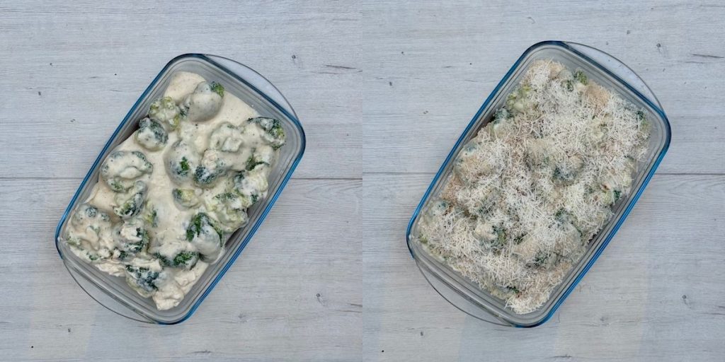 - Mix the cheese sauce with the broccoli and transfer to a baking dish. Scatter with bread crumbs and parmesan.