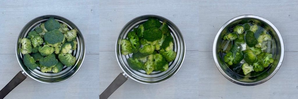 - Steam the broccoli over a pan of boiling water for 4 minutes. Drain and plunge into an iced water bath. Drain again.