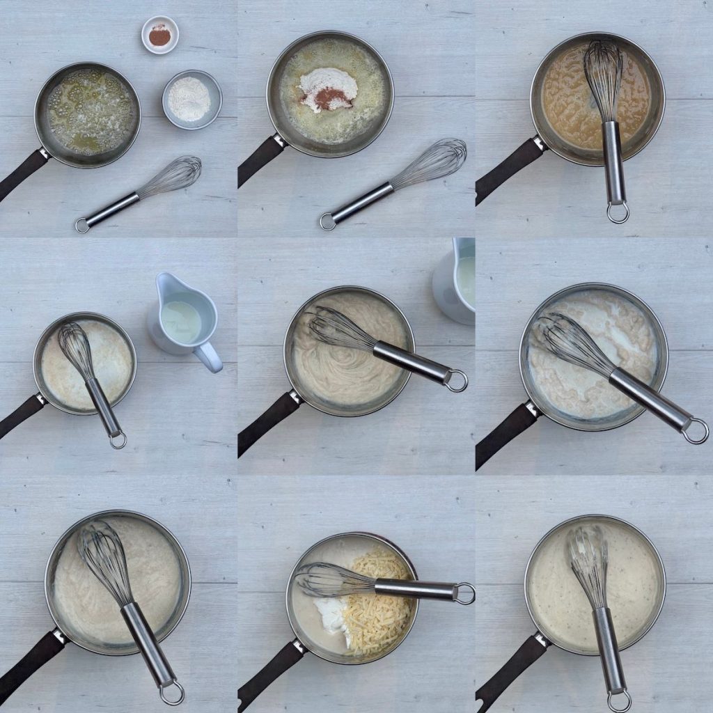 - Melt the butter in a pan over medium heat. Add the flour and nutmeg and cook for about 2-3 minutes, whisking, until nutty smelling.