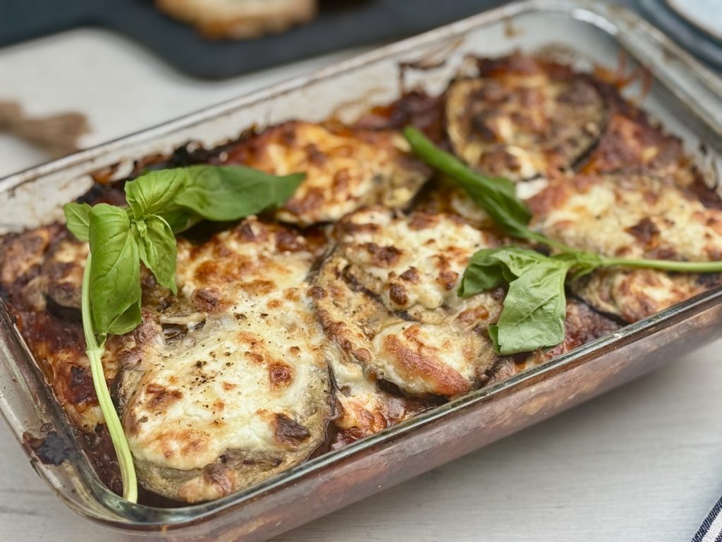 In this dish, we’re not breading and frying the chicken, but just grilling it, and adding in some grilled eggplant as well. This makes the dish much more healthful and lower in calories.