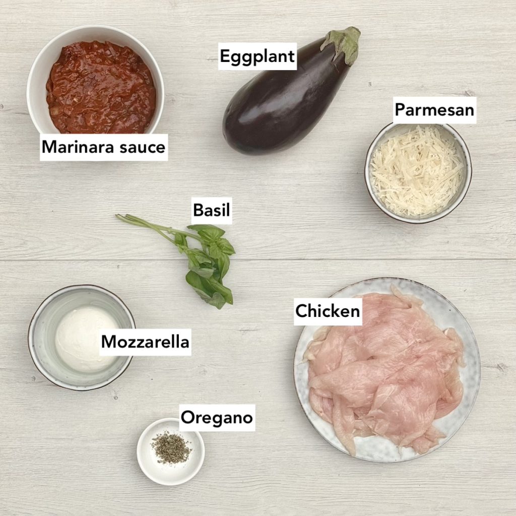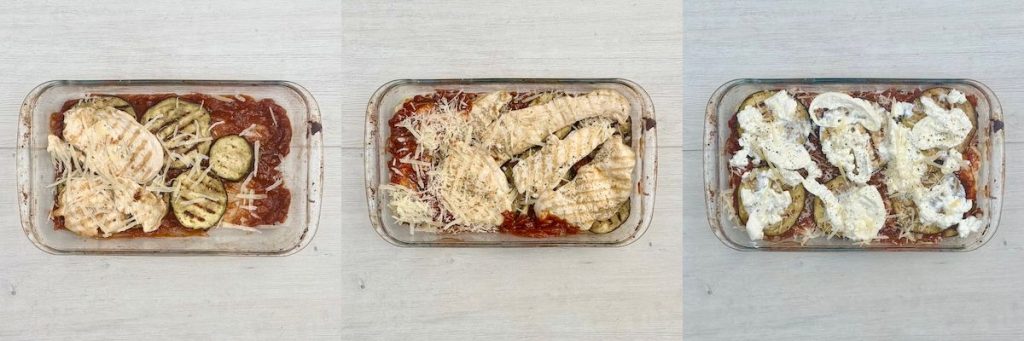 - Layer the eggplant and chicken in a baking dish, interspersing with marinara sauce and sprinkling over oregano and parmesan as you go.