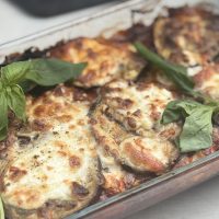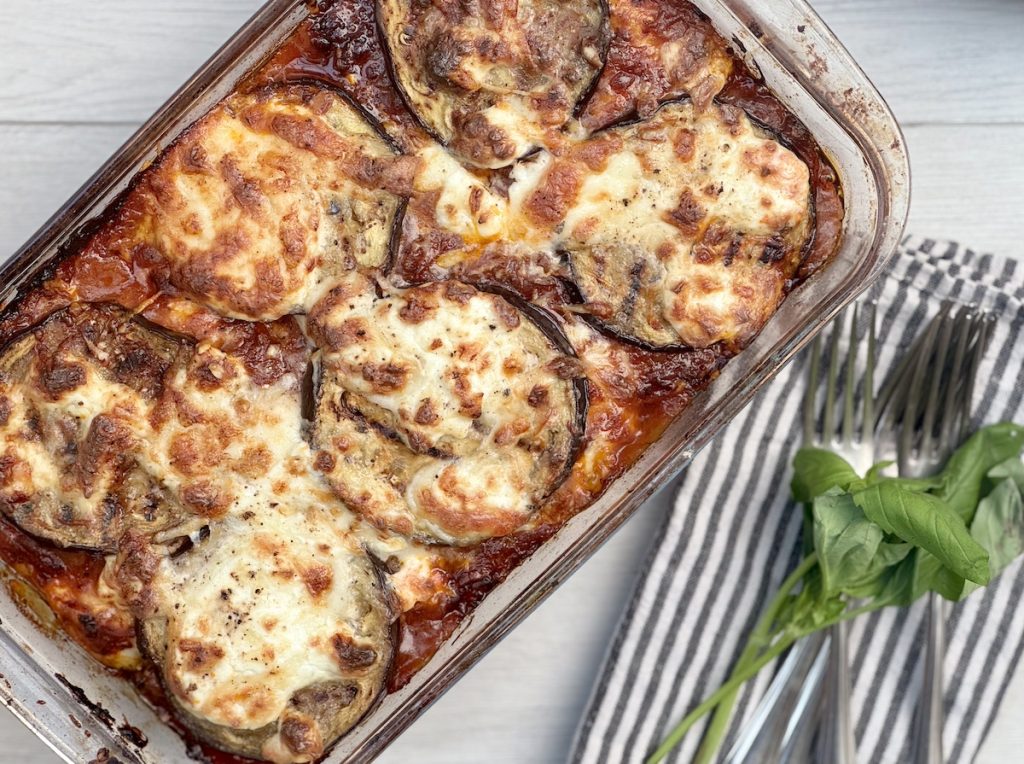 This is the primary reason why chicken eggplant parmesan is healthier than regular chicken parmigiana. Instead of using breaded, fried chicken cutlets, we’re grilling thin slices of chicken breast, just brushed with a little oil – less fat, less carbs, and far fewer calories. We’re also adding in slices of eggplant for some additional vitamins. As well as sneaking in some extra veggies, the eggplant also adds a beautiful, silky texture to the dish.