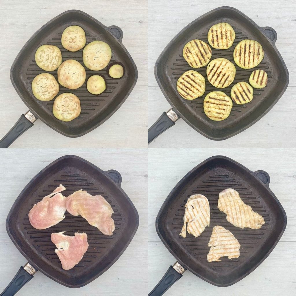 - Brush the eggplant and chicken slices with olive oil. Grill for just 1 minute each side until browned.