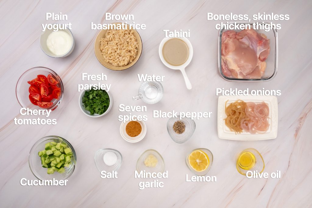 - In serving bowls, layer the cooked rice as the base. Top with sliced chicken, diced cucumber, halved cherry tomatoes, pickled onions, and chopped parsley.