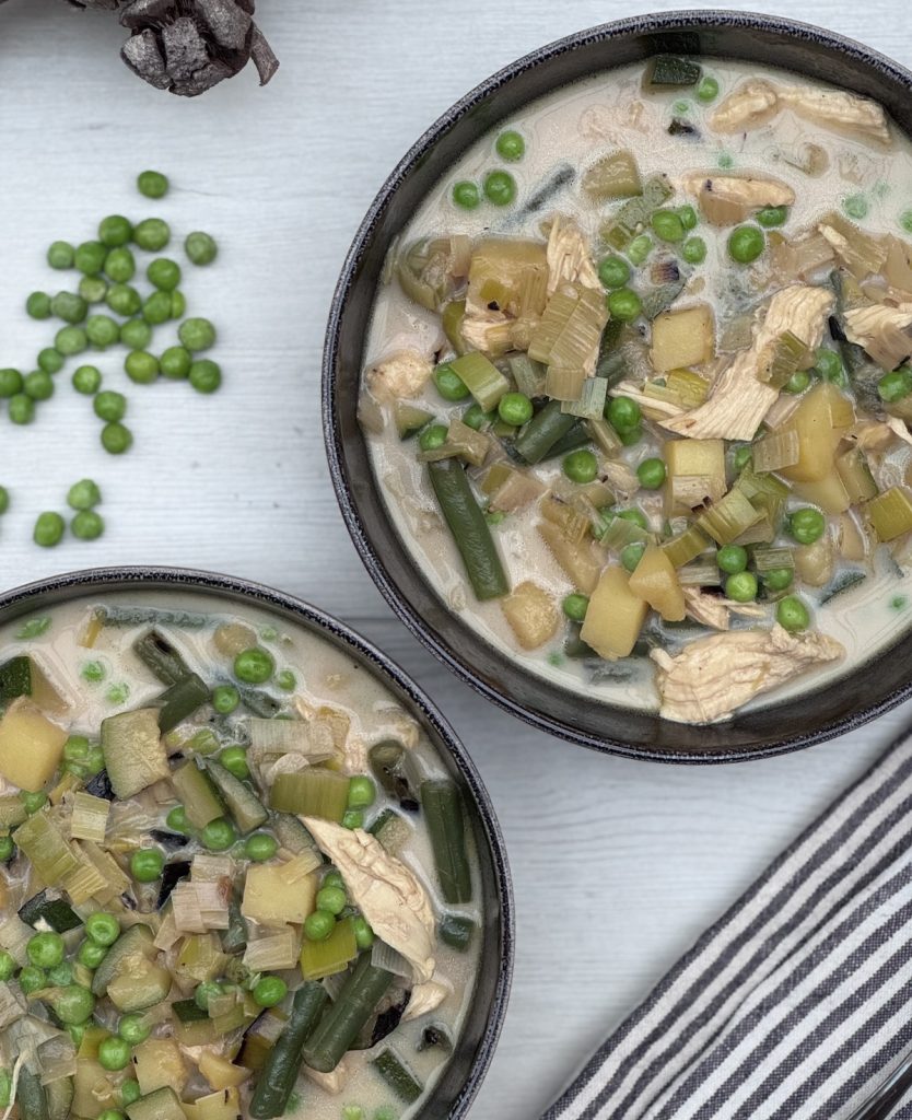 • Add the peas, milk, and chicken. Bring to a boil, then turn off the heat and season to taste with salt and pepper. Serve hot, optionally with bread on the side.