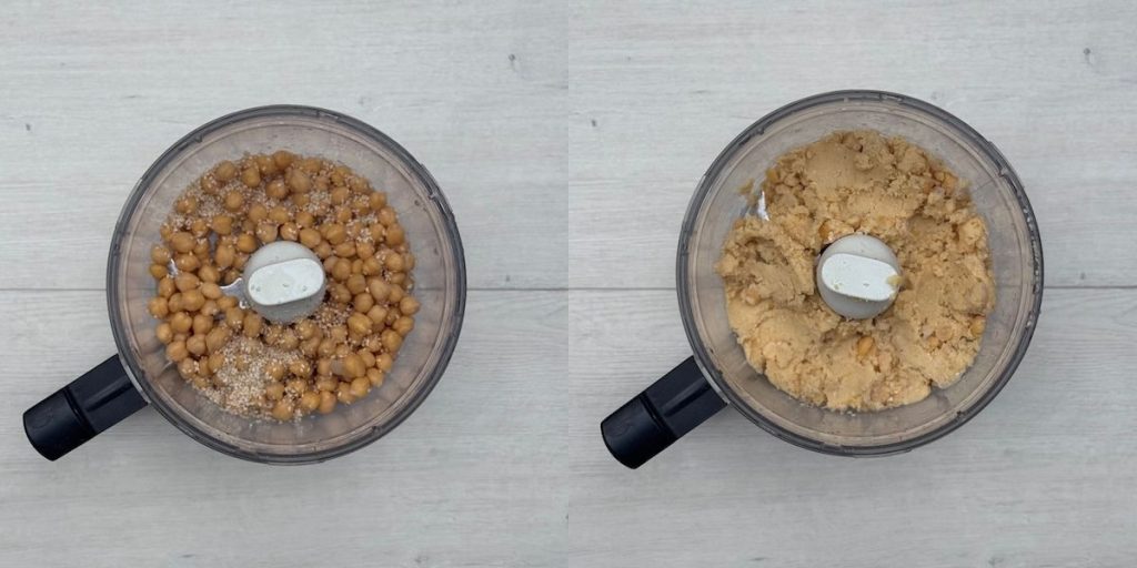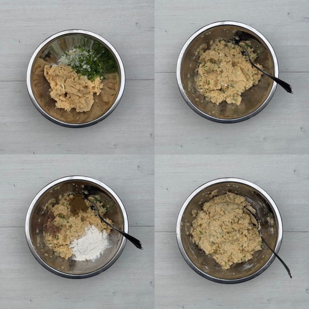 Now, here is a little pro tip: because these patties can be a bit delicate, we’re adding some flour to the mix to help bind everything together. Traditional falafel are usually gluten-free, and their delicateness doesn’t usually matter because deep-frying them gives them a quick, hard crust on the outside to seal everything in instantly.