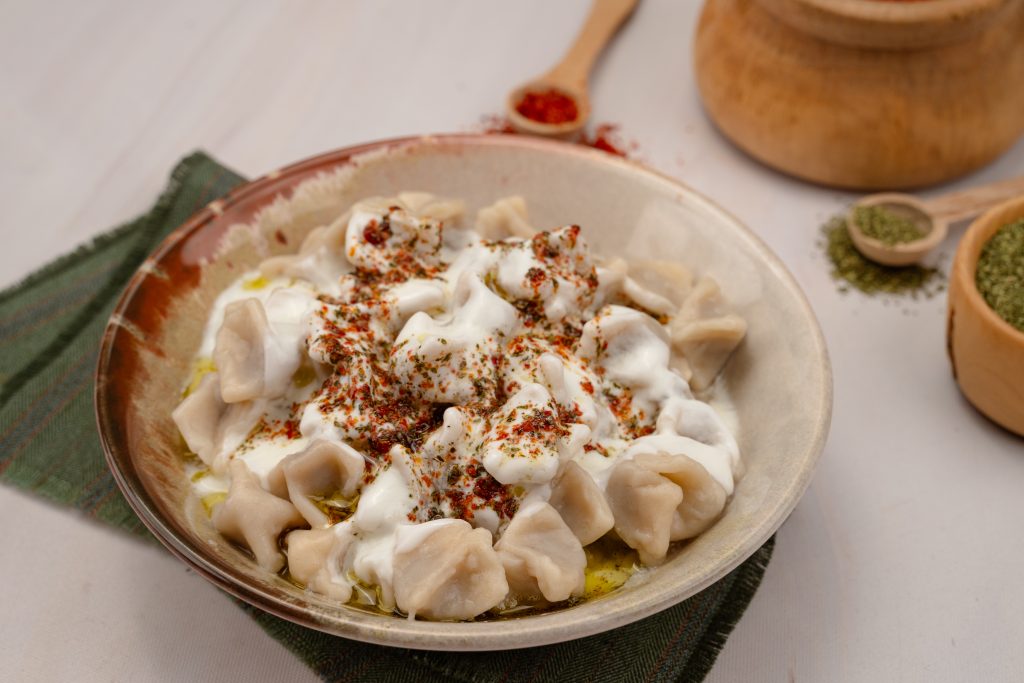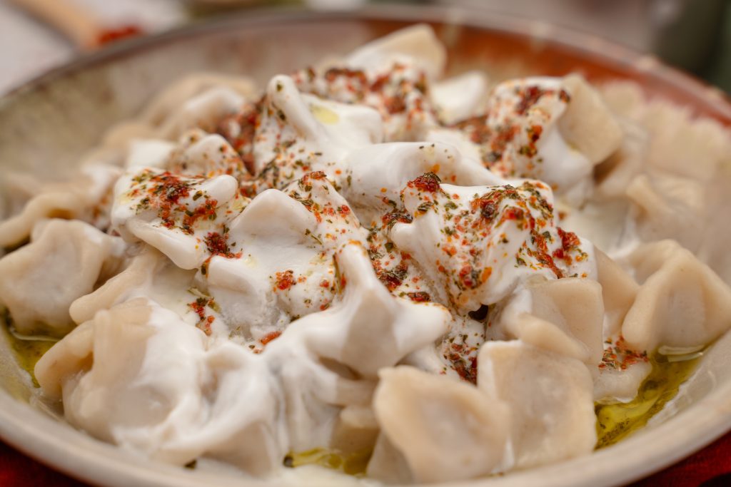 Manti – Turkish dumpling – is a dish filled with flavorful ground beef, served with a tangy yogurt garlic sauce and topped with a rich butter sauce. Each small piece of dough is meticulously folded, creating little pouches of deliciousness. While the process takes some time, the result is incredibly rewarding—a comforting, flavorful meal that showcases the richness of Turkish cuisine.