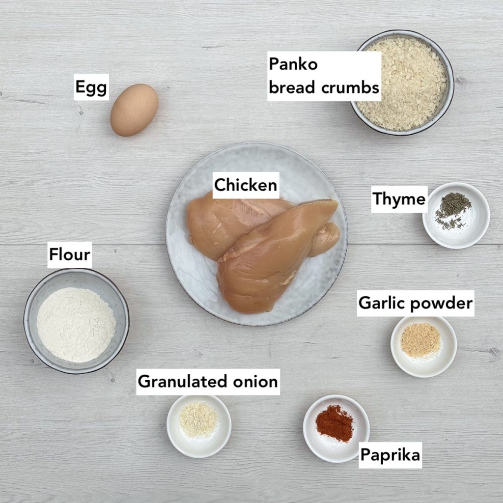 Because the bread crumbs themselves aren’t flavored, you’ll want to season the chicken with some herbs and spices. What you choose is up to you, but I kept it relatively simple with garlic, onion, paprika and thyme. Other flavors that would also work include chili, lemon, rosemary, or cumin. Or you could even try leaning heavily in the Japanese direction and marinate it with ginger and soy sauce, for chicken karaage.