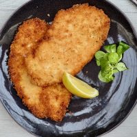 Lower the breaded chicken into the hot oil and fry for about 2 minutes each side. Don’t overcrowd the pan by putting too many in at once. You don’t want the temperature of the oil to reduce too much. Once golden brown on both sides, use a pair of tongs or a slotted spoon to lift the chicken out and leave to drain on kitchen paper. Keep warm while you fry the remaining chicken.