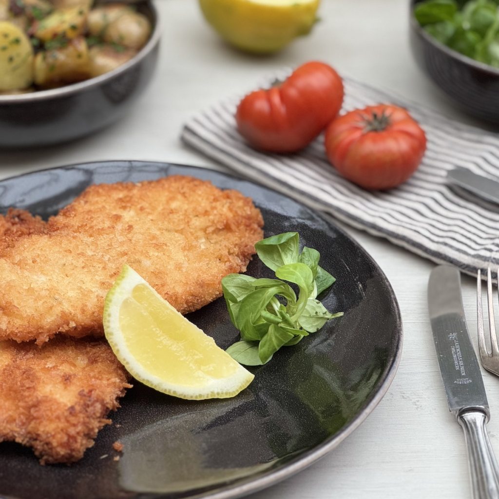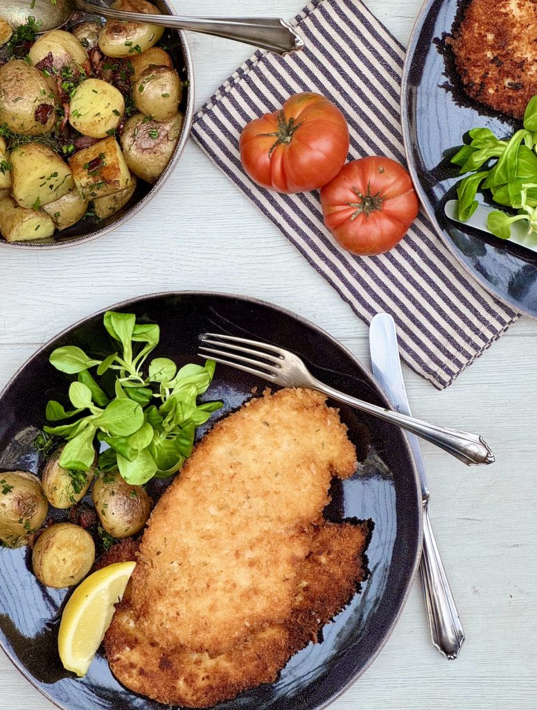 It’s really up to you, but I chose a simple potato salad with some green leaves and fresh tomatoes on the side. I do think you will definitely want a lemon or lime wedge to squeeze over the chicken, though – the acidity sharpens up the richness of the crunchy fried chicken.
