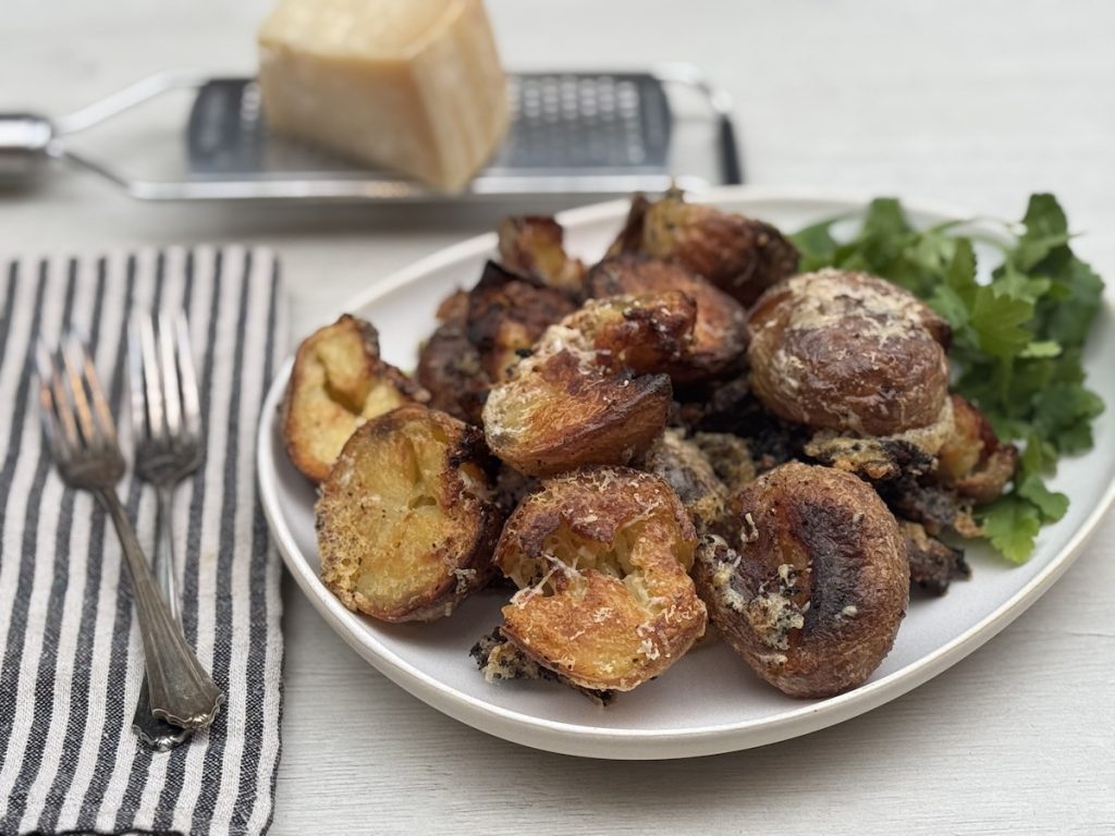 The potatoes to use for parmesan roasted potatoes are waxy potatoes. This is because we’re using the crushing method to roughen up the edges. Floury potatoes will fall apart completely if you do this to them. If you can only find floury potatoes, though, you can still make the recipe. Just use the shaking method to roughen up the potato edges instead. I also prefer baby potatoes for this recipe.