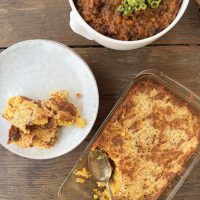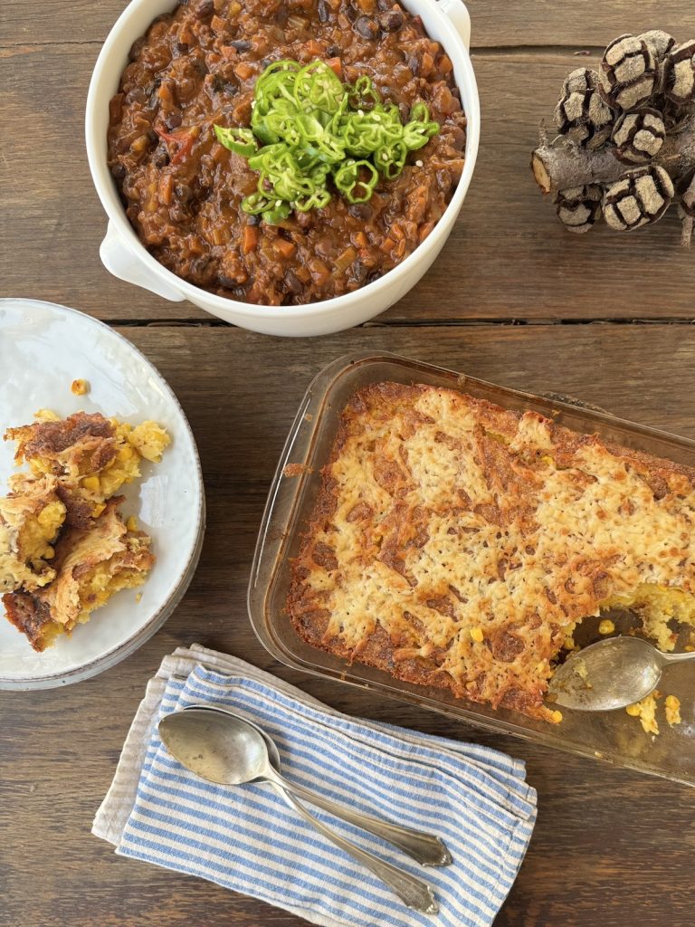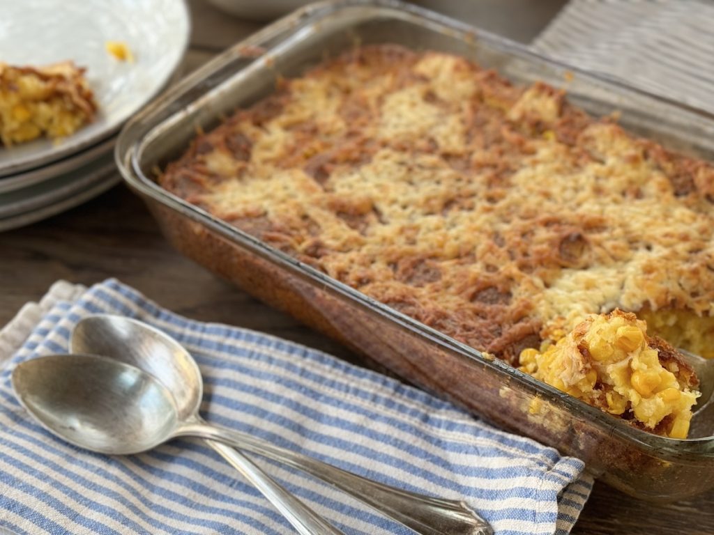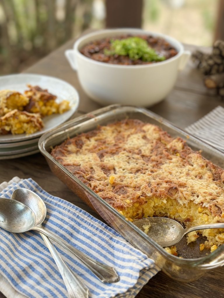 Cheesy corn casserole is most definitely going to feature on my Thanksgiving table this year! But I’ve recently been serving it with chili con carne, and I think it would go well with any typical Southern, Mexican, or South American dish, like one of these: