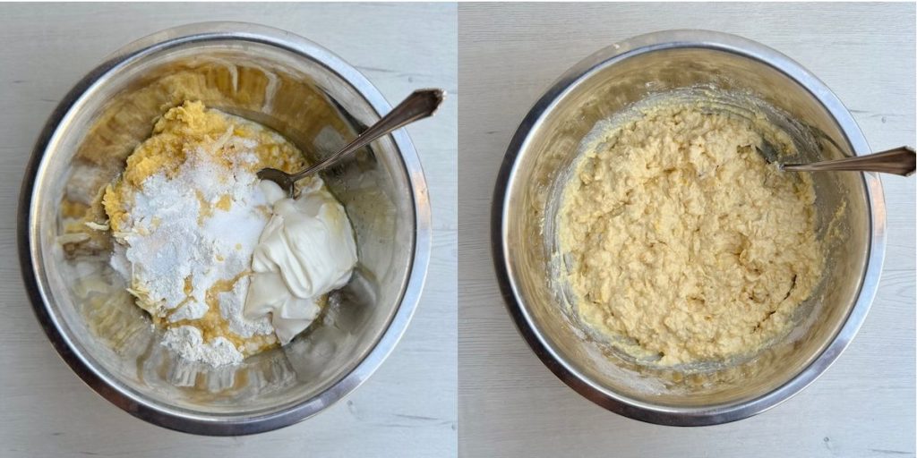 Paula Deen’s corn casserole is one of the easiest dishes I have ever made. All you need to do is to mix the ingredients together, put into a greased casserole dish, and bake. Paula Deen herself even uses a store-bought corn muffin mix, instead of mixing her own cornmeal and flour, making it easier still! I’ve given instructions for both in the recipe to follow. If you’re planning on buying rather than mixing, the most popular brand is Jiffy Corn Muffin Mix.