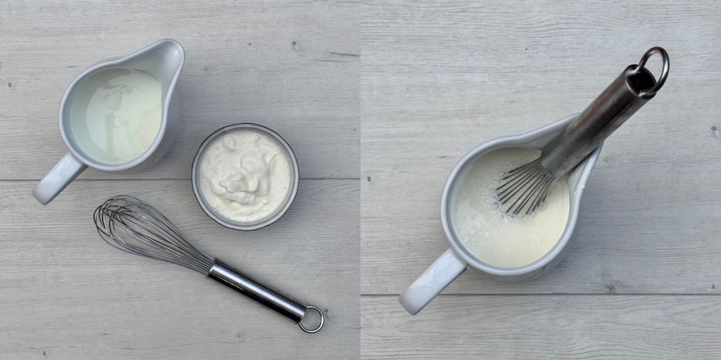 We are also ensuring the liquid stays rich by whisking together the milk and sour cream. The sour cream not only adds a wonderful tangy flavor but also thickens the dairy mixture, helping it cling beautifully to the potatoes during the bake.
