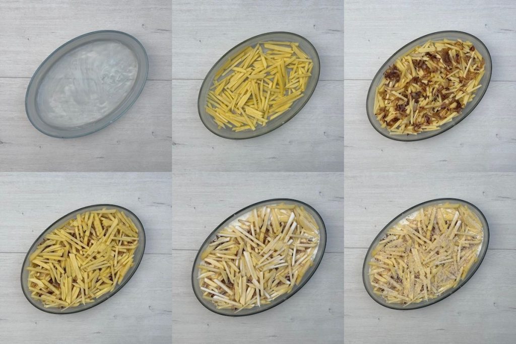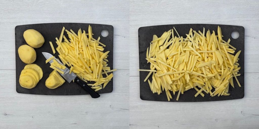 - In the meantime, cut the potatoes into matchsticks. Use the remaining butter to grease a baking dish.