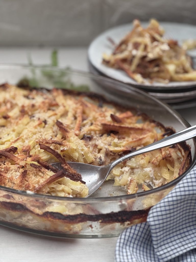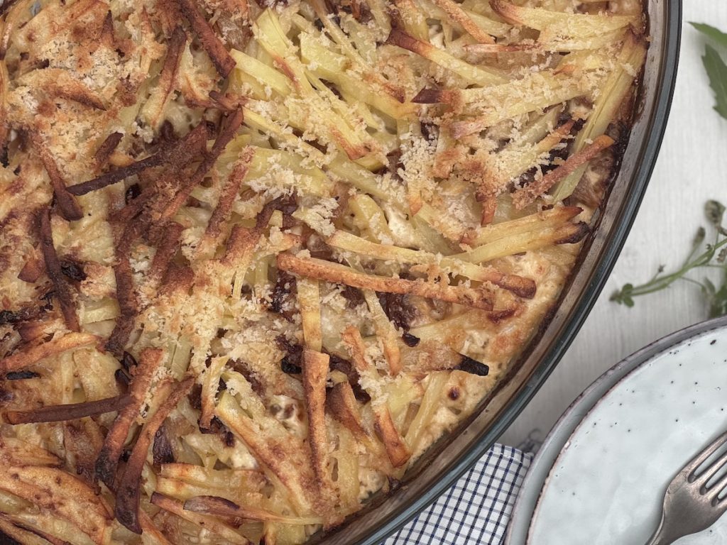 A potato casserole is a broad term for any dish containing potatoes baked together in the oven. The most common versions involve cream or milk and are known worldwide as scalloped potatoes, potatoes dauphinoise, or potatoes gratin. My recipe is a special version of these, based on Jansson’s Temptation. This Swedish classic is unique because it includes savory ingredients that elevate it beyond a simple creamy bake. My adaptation of the casserole includes layers of thinly cut potatoes, caramelized onions, and, most importantly, a wonderful umami hit from anchovies. No one knows who Jansson was, but after a single bite, you will understand why he was tempted!