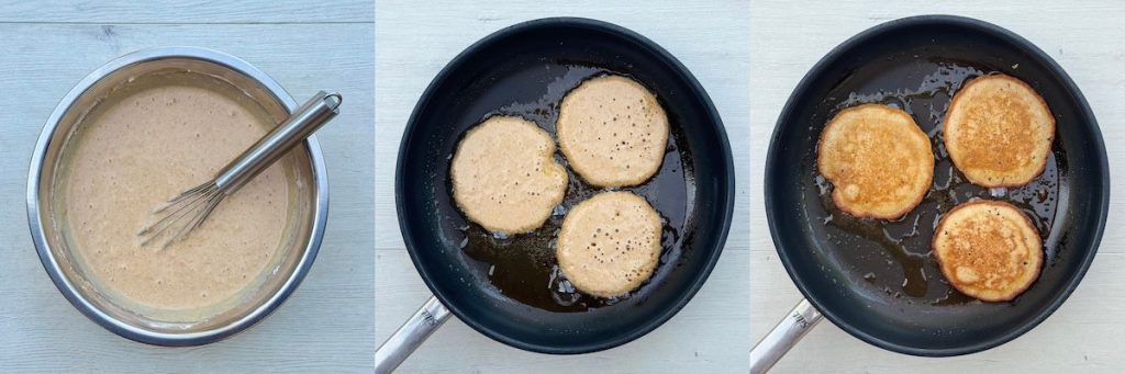 If you’ve ever made pancakes before, the method for these is no different. Simply heat up the oil, and drop dollops of batter into the hot pan, letting them spread out into pancakes. But if it’s new for you, not to worry! It’s incredibly easy. Here’s the step by step guide: