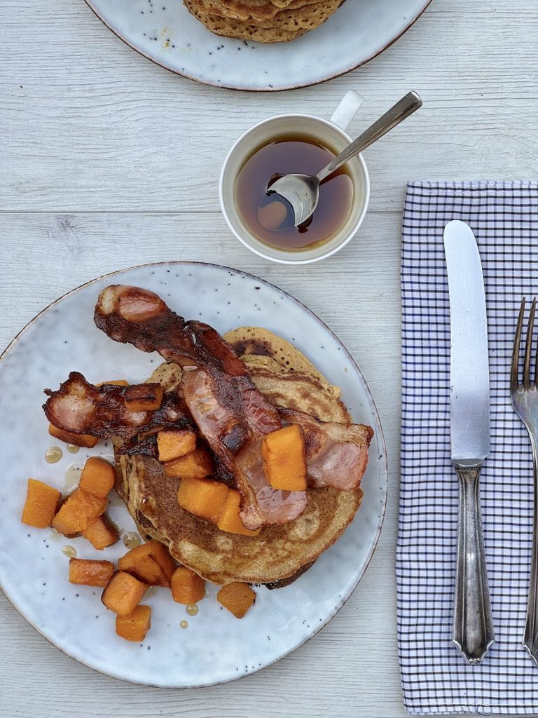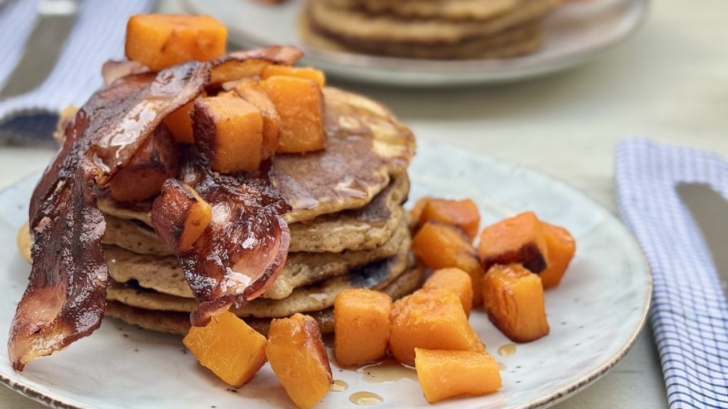 I especially love breakfasts that strike a balance between sweet and savory, so I decided to lean into that here. I topped my pancakes with roasted pumpkin and crispy fried bacon and maple syrup. But honestly, you could use whatever you like. Go fully sweet with whipped cream and berries, or salt it up more with sausage and eggs on the side. Both will taste good.
