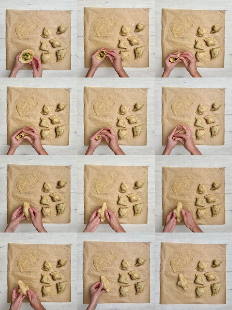 - Fold each one in half and press the flat edges firmly together to seal into an open cone shape. Fill the cones with the filling and press the open tops together firmly to seal.