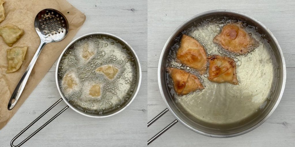 - Heat the oil in a pan over medium-high heat, to a temperature of 325°F. Deep fry the samosas for about 10 minutes, until golden brown. Eat hot or leave to cool.