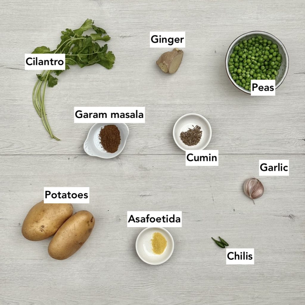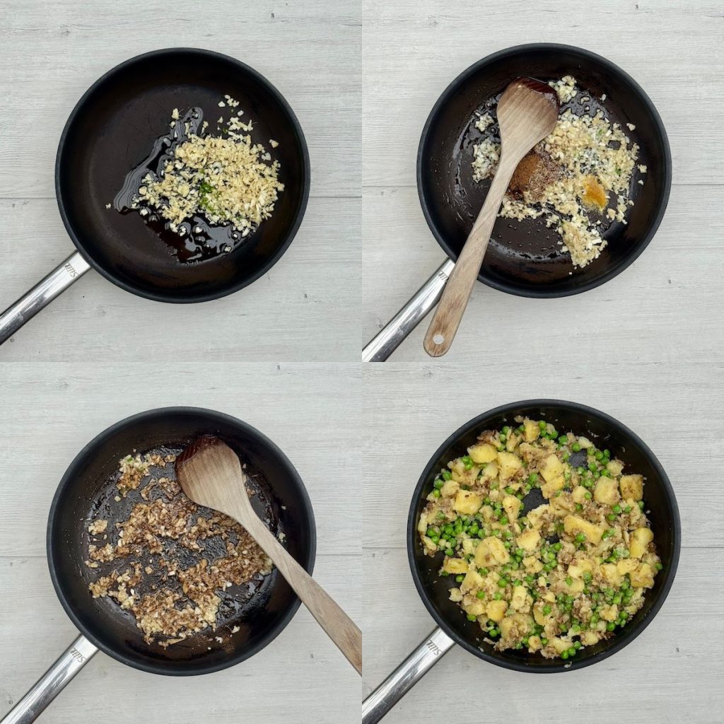 - Add the spices and cook for 1 minute to bloom. Add the peas and cooked potatoes.