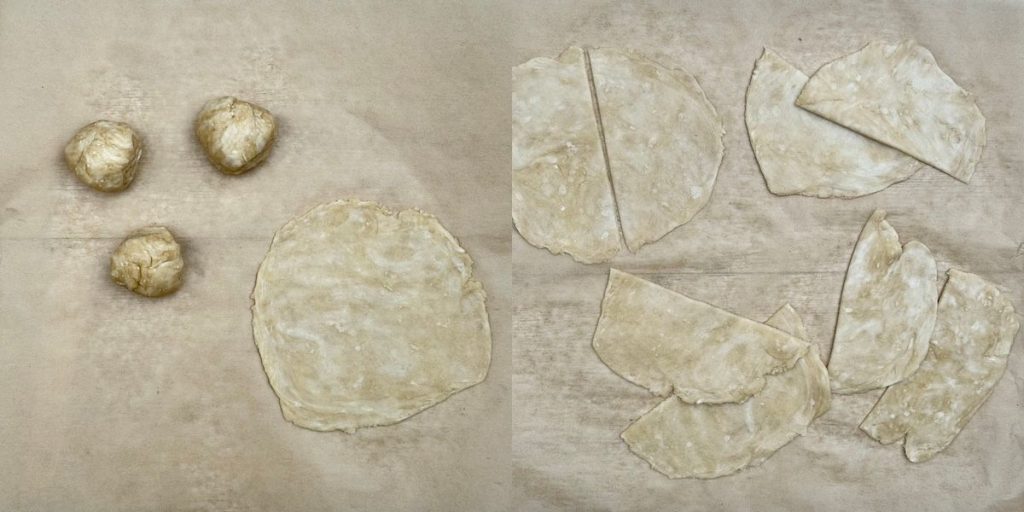 Start by dividing your rested dough into four equal pieces. Roll each piece into a neat circle approximately 6 inches in diameter. Next, cut each circle in half, creating two half-moon shapes from each circle.