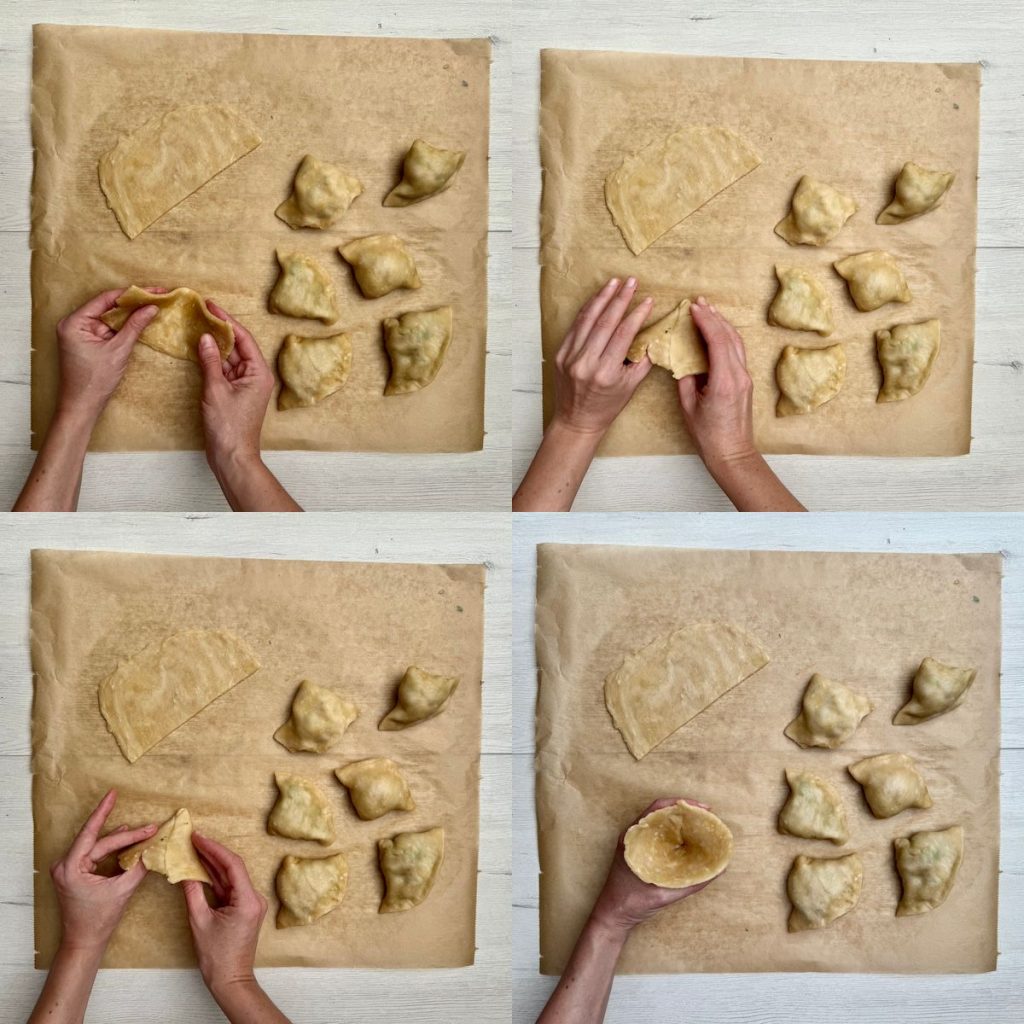 To shape, take one half-moon and slightly dampen the straight edge with a tiny bit of water. Fold the dough over to meet the other side of the straight edge, overlapping the edges slightly to form a cone shape. Press the seam firmly together to seal it.