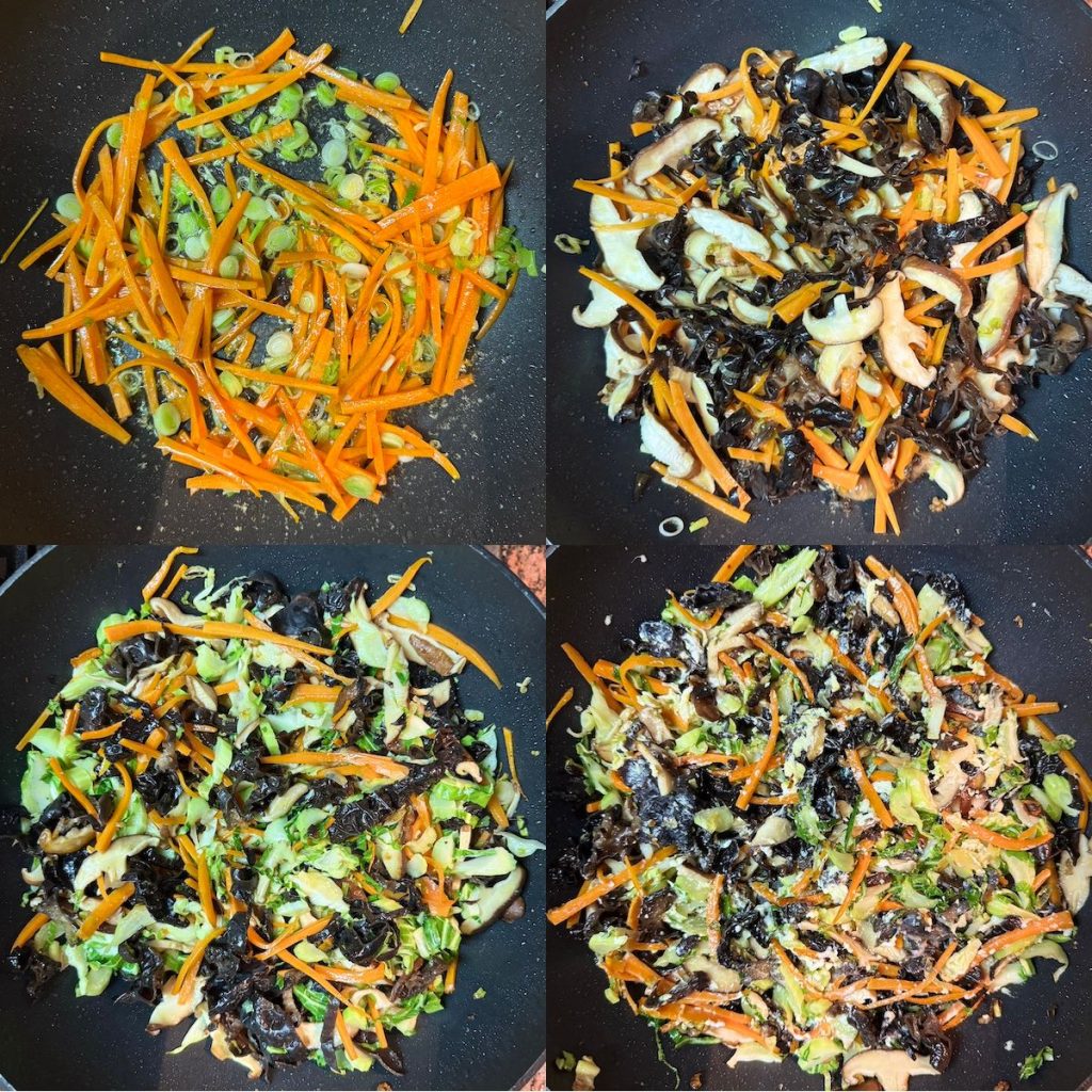 - Add the shiitake mushrooms and the wood ear mushrooms. Fry for another 3 minutes.