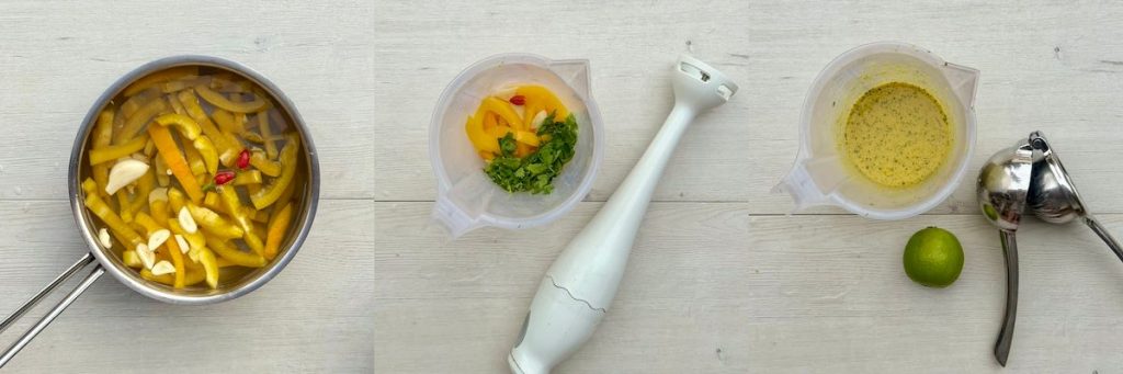 To make our mild yellow chili sauce, we’re just blanching the peppers, garlic and ginger, then blending them with the other sauce ingredients. Add the lime juice to taste, at the end. You will want more than you think!