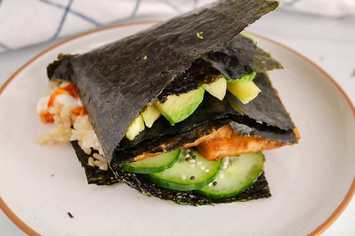 These delightful little nori wraps fold the seaweed in a different way to create a vehicle for the filling. This is a vegan version, but you could use whatever filling you liked.