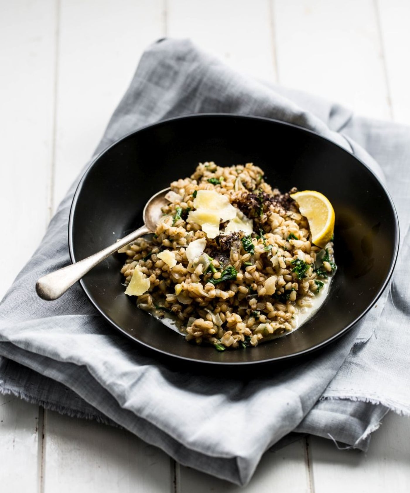 A gorgeous barley risotto with parmesan and toasted nori flakes mixed in, for the ultimate in vegetarian umami flavor, with a great nubbly texture from the barley grains.