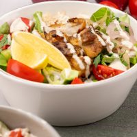 In serving bowls, layer the cooked rice as the base. Top with sliced chicken, diced cucumber, halved cherry tomatoes, pickled onions, and chopped parsley.