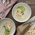 Pour into bowls, and swirl a tablespoon of crème fraîche inside. Top with a few slices of avocado, some shredded cold chicken, and scatter over the chives.